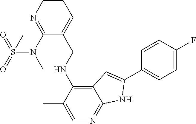 - WVRLCJBOALKTND-UHFFFAOYSA-N n-methyl-n-[3-[[(5-methyl-1h-pyrrolo[2,3-b]pyridin-4-yl)amino]methyl]pyridin-2-yl]methanesulfonamide Chemical compound CS(=O)(=O)N(C)C1=NC=CC=C1CNC1=C(C)C=NC2=C1C=CN2 WVRLCJBOALKTND-UHFFFAOYSA-N 0.000 claims description 2