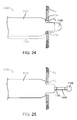 FIG. 24 is a side view illustration of a first step of the method of using the suturing device of FIG. 17 according to an embodiment hereof, wherein the suturing device is advanced towards and positioned through the arteriotomy.