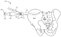FIG. 4B illustrates an exemplary drill guide assembly placed over a guide pin. Here, diagram 420 may include drill guide 404, pin sleeve head 406 (of pin sleeve 402), threads 408 (of pin sleeve 402), handle 412, drill guide head 414, drill guide tip 416 and guide pin 418. Like-numbered and named elements in this view may describe the same or substantially similar elements as in previous views (e.g., FIG. 4A). In some examples, guide pin 418 may be a medical grade sterile metal pin (e.g., Kirschner wire, Steinmann pin, or other metal pin) suitable for use in medical procedures. In some examples, guide pin 418 may be used for alignment and guidance of a drill guide (e.g., drill guide 404), an implant (e.g., a screw or other implant), and other tools. As shown, drill guide tip 416 is engaged with an ilium (i.e., its spikes, teeth, wedges or other structure for engaging a bone, are embedded in the ilium). In other examples, drill guide assembly 400 may be formed differently and is not limited to the examples described.