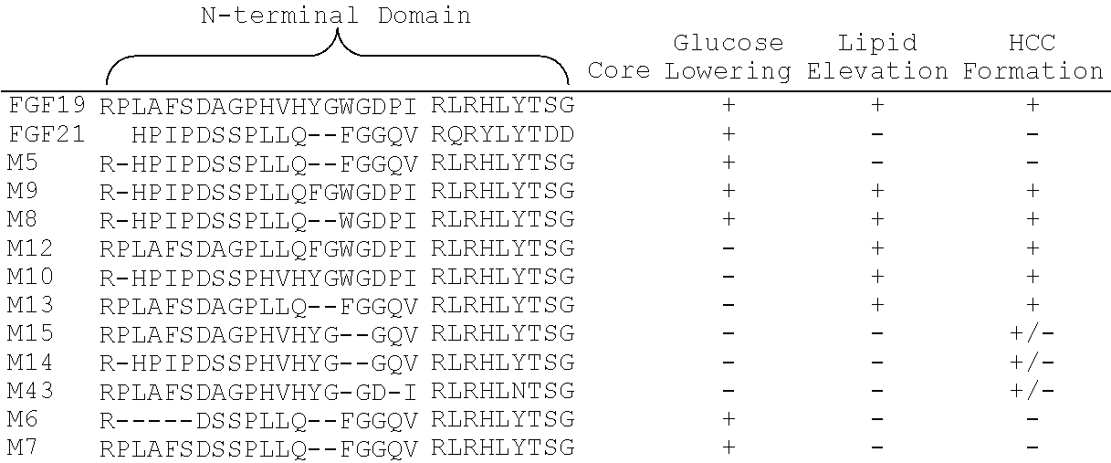 Referring to Table 10, the P128E substitution appears necessary to significantly prevent HCC formation, but is insufficient by itself to prevent HCC formation. In particular, an improvement in preventing HCC formation is observed with the P128E substitution in M140. Conversely, by itself the R127L substitution does not prevent HCC formation (see M139). As indicated in comparison to M3, a combination of the R127L and P128E substitutions decreases HCC formation but does not eliminate HCC formation. Surprisingly, however, a combination of the R127L and P128E substitutions along with a substitution of Gln(Q) for Leu (L) in the FGF19 core region does significantly prevent HCC formation (see M160).