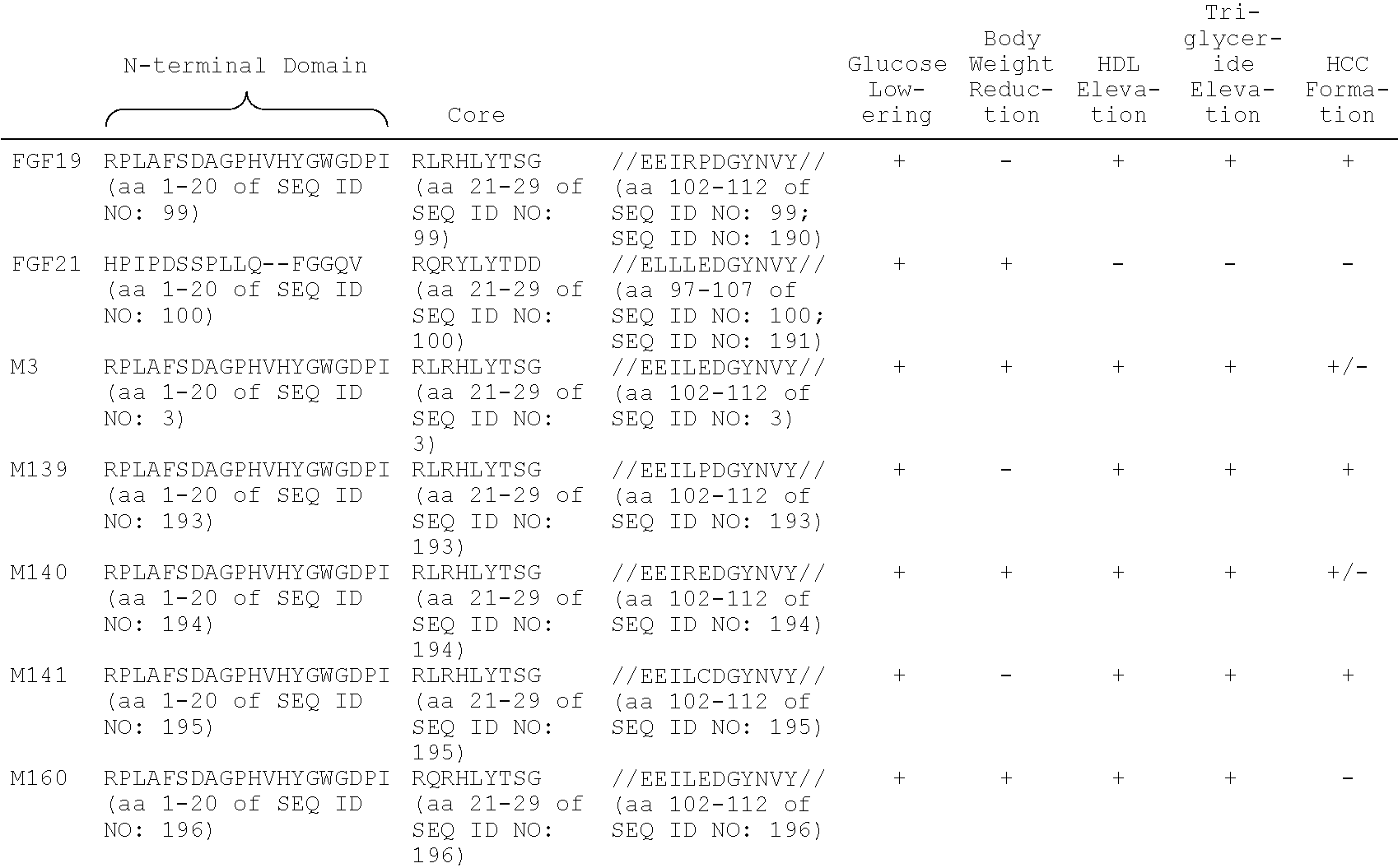 Only the following sequence domains for each of the aforementioned variants are listed in Table 9: N-terminal domain, Core, and Sheet-8/Loop-8/Sheet-9 region. While the particular amino acid residues making up the Loop 8 region are not universally accepted in the literature, FGF19 residues 127-129 are defined herein as constituting the Loop-8 region.