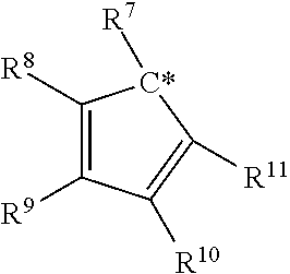 In some embodiments according to the invention, both of R*1 and R*2 independently comprise a substituted or unsubstituted cyclopentadienyl radical, wherein one of R*1 and R*2 independently comprises a substituted or unsubstituted cyclopentadienyl radical represented by the formula: