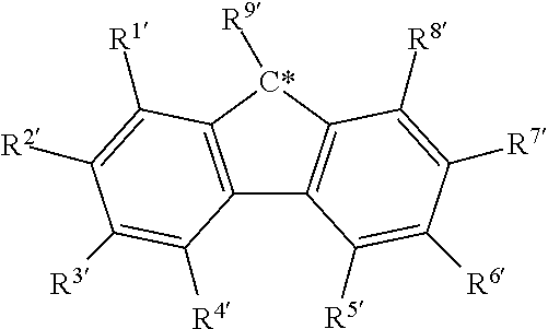 For purposes herein, a fluorenyl or substituted fluorenyl radical is represented by the formula: