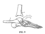 Referring now to the drawings wherein are shown preferred embodiments and wherein like reference numerals designate like elements throughout, there is shown in FIG. 1 a lateral, elevational view of a right, human foot that illustrates most of the foot bones and the lower ends of the lower leg bones. The present invention involves three of these bones: the fibula 2, the tibia 4 and the talus 6.