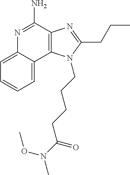 The material from Step 5 was treated according to a modification of the procedure described in Step 2 of Example 34. The reaction mixture was worked up by separating the layers using a separatory funnel. The organic layer was washed with saturated aqueous sodium bicarbonate and brine, dried over magnesium sulfate, filtered, and concentrated under reduced pressure. The crude 5-(4-amino-2-propyl-1H-imidazo[4,5-c]quinolin-1-yl)-N-methoxy-N-methylpentanamide was purified by flash chromatography (silica gel, eluted with 10% methanol in dichloromethane) to provide a solid. Acetone was added to the solid and the mixture was sonicated. The solid was isolated by filtration and dried at 80° C. in a vacuum oven to provide 5-(4-amino-2-propyl-1H-imidazo[4,5-c]quinolin-1-yl)-N-methoxy-N-methylpentanamide as beige needles, mp 150-151° C.