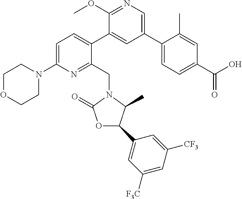 A solution of TFA (0.095 mL, 1.240 mmol) and tert-butyl 4-[2′-({(4S,5R)-5-[3,5-bis(trifluoromethyl)phenyl]-4-methyl-2-oxo-1,3-oxazolidin-3-yl}methyl)-2-methoxy-6′-(morpholin-4-yl)-3,3′-bipyridin-5-yl]-3,5-dimethylbenzoate (EXAMPLE 55, 44 mg, 0.055 mmol) in CH2Cl2 (0.5 mL) was stirred at room temperature overnight, after which time TLC and LCMS showed the reaction to be complete. After solvent was removed in vacuo, the crude was dissolved in CH3CN and purified by reverse phase HPLC (C18 stationary phase, using a gradient from 10-100% CH3CN/water (modified with 0.05% TFA) to give the titled compound (33 mg, 0.038 mmol, 70% yield) as white solid after lyophilization. LCMS (M+H)+: 731.0. 1H NMR (CD3OD, 500 MHz): δ 8.18 (d, 1H), 7.99 (s, 1H), 7.97 (s, 1H), 7.91 (d, 1H), 7.89 (s, 2H), 7.63 (d, 1H), 7.51 (d, 1H), 7.38 (d, 1H), 6.88 (d, 1H), 5.79 (d, 1H), 4.73 (d, 1H), 4.20-4.31 (m, 1H), 4.03-4.17 (m, 1H), 3.99 (s, 3H), 3.83 (t, 4H), 3.60 (t, 4H), 2.38 (s, 3H), 0.66 (brd, 3H). RTA IC50: 9 nM.