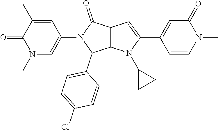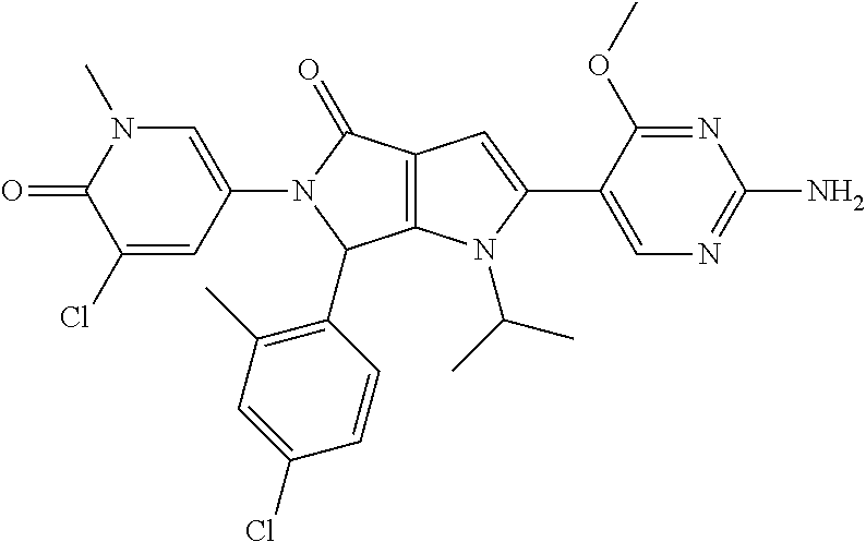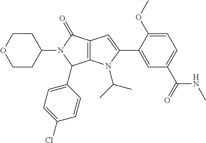To test PPI inhibitors on cell growth, SJSA-1 cells (p53 wild-type cells) and SAOS-2 cells (p53 null cells) are plated out into 96-well micro-titer plates and treated with decreasing concentrations of the compounds. After a 72 hour incubation period, 2.5 μM YO-PRO®-1 iodide is directly added to the cells and a first read-out is performed using a standard fluorescence plate reader (filter setting 485/530 nm) revealing the relative number of apoptotic cells. Subsequently, cells are permeabilized by directly adding lysis buffer containing the detergent NP40, EDTA and EGTA to obtain final concentrations of 0.01% and 5 mM, respectively. After complete permeabilization, the total cell number is quantified during a second read using the fluorescence plate reader with the same settings.