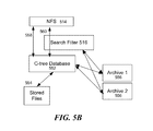 FIG. 5B is a block diagram depicting an example of the operation of a search filtered file system. In some implementations without the search filter 516 described above, the NFS interface 514 that enables a user to search through network files may exchange messages 558 with a c-tree database 552 that provides the NFS interface 514 with information regarding files and folders available on stored files 554 in the network. The c-tree database 552 may include information about files stored in archives or secondary storages 556. However, files stored in a typical file archive are deduplicated and encoded to achieve data compression (not in a native format), and therefore may not be accessible via the NFS 514 for user interaction such as open, close, move, copy, etc.