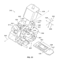 FIG. 15 is a top perspective view of a flow cover 522 illustrating a flow channel 524 in phantom. As shown, the flow channel 524 extends between inlet and outlet ports 526 and 528 and includes a plurality of channel regions, including a diffuser region 530, a field region 532, and a collector region 534. The diffuser region 530 is shaped to distribute the fluid to the field region 532 and may be oriented such that the flow direction is parallel to a vertical axis 590. The diffuser region 530 has first and second flow cross-sections C1 and C2 that are taken perpendicular to the vertical axis 590. The term “flow cross-section,” as used herein, is a cross-section of a fluidic channel that is taken substantially transverse to a direction of the flow of fluid. For example, the flow of fluid through flow cross-sections C1 and C2 in FIG. 15 is generally out of (or into) the page.