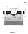 At 370, a photolithographic process can be used to selectively deposit photoresist in all areas outside a region where a source and drain region are to be formed. For instance, FIG. 4E is a diagram showing a cross section of an intermediate stage 400E in the fabrication of a power MOSFET, and a source region 404 is formed. As an example, an arsenic n-type implant can be used to form the source region 404 and drain region 408. After cleaning, a source implant anneal can be performed.