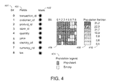 In the above scenario, the data quality of the Transactions dataset 300 can be analyzed by assigning a data pattern code 316 to each record 304. For example, the data pattern code 316 can reflect which fields 320 of the transaction record 304 are populated and which fields are not populated. Assuming a bitmap code formulation, bits of the bitmap code can be assigned to corresponding fields of a transaction record as follows: transaction_id (bit 0), customer_id (bit 1), product_id (bit 2), store_id (bit 3), quantity (bit 4), price (bit 5), country_cd (bit 6), currency_cd (bit 7), and tax (bit 8). If a field of the transaction record is populated, the corresponding bit is set to 1 otherwise the bit is set to 0. Generalizing, in decimal notation, if for example, bit “k” is set to 1, then a value of 2k is added to the bitmap code. For example, if the transaction_id, customer_id, product_id, price and tax were populated, the data pattern code would be 151 ( bits 0, 1, 2, 5 and 8 set correspond to 1+2+4+32+256=295).