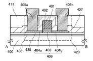 An inorganic insulating film may be used as each of the base insulating films 436 and 438. It is preferable to use, for example, a silicon oxide film, a silicon oxynitride film, an aluminum oxide film, an aluminum oxynitride film, a hafnium oxide film, a gallium oxide film, a silicon nitride film, an aluminum nitride film, a silicon nitride oxide film, or an aluminum nitride oxide film. Further, the base insulating films 436 and 438 each can be formed with a single-layer structure or a stacked-layer structure including two or more layers with the use of these compounds. The base insulating films 436 and 438 may include the same material or different materials.