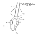 FIG. 18 also illustrates certain novel features of construction and of the laryngeal cuff. Turning first to the cuff, in this embodiment thin, flexible featherlike flanges 140 and 141 have been introduced on opposing sides of the cuff. These are preferably formed as an integral part of the moulding of the cuff and, because of the very soft nature of the material used to form the cuff, these flanges are particularly soft and pliable. Their purpose is to make allowance for any individual patient variation in the laryngeal inlet shape and to contribute to forming an efficient and effective seal between the cuff and the laryngeal structures. By this design, and by designing the cuff to be a close anatomical fit, the obtainable seal pressure from experimental trials is well in excess of 30 cm H2O.