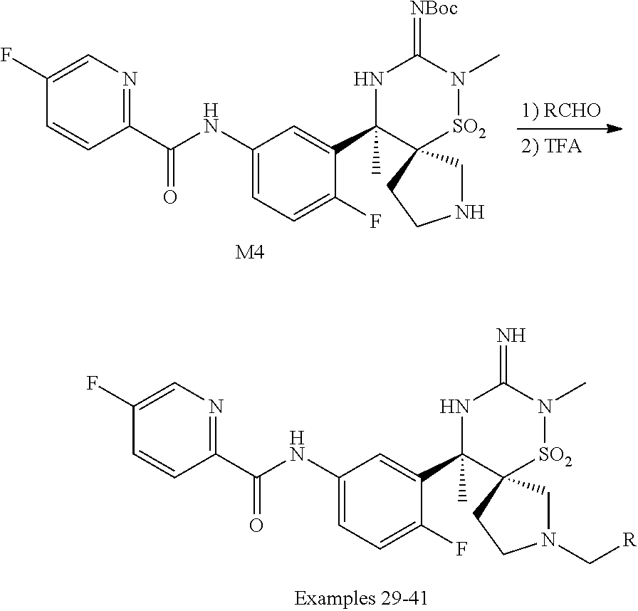 Parallel preparation of Examples 63-72: These examples were prepared from M3 and the requisite sulfonyl chlorides using a procedure similar to that described in Method R. The crude residues were purified by mass triggered HPLC using the following conditions: [column: Waters XBridge C18, 5 μm, 19×100 mm; solvent: gradient range 12-27% initial to 42-57% final MeCN (0.1% NH4OH) in water (0.1% NH4OH) 25 mL/min; 8 min run time] to afford Examples 63-71. Example 72 was repurified by mass triggered HPLC using the following conditions: [column: Waters Sunfire C18, 5 μm, 19×100 mm; solvent: gradient of 10% initial to 32% final MeCN (0.1% formic acid) in water (0.1% formic acid) 50 mL/min; 8 min run time] to afford Example 72.