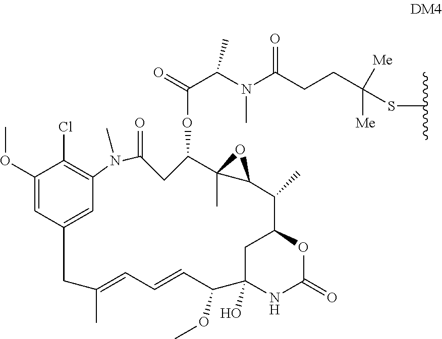The term “maytansinoid drug moiety” means the substructure of an antibody-drug conjugate that has the structure of a maytansinoid compound. Maytansine was first isolated from the east African shrub Maytenus serrata (U.S. Pat. No. 3,896,111). Subsequently, it was discovered that certain microbes also produce maytansinoids, such as maytansinol and C-3 maytansinol esters (U.S. Pat. No. 4,151,042). Synthetic maytansinol and maytansinol analogues have been reported. See U.S. Pat. Nos. 4,137,230; 4,248,870; 4,256,746; 4,260,608; 4,265,814; 4,294,757; 4,307,016; 4,308,268; 4,308,269; 4,309,428; 4,313,946; 4,315,929; 4,317,821; 4,322,348; 4,331,598; 4,361,650; 4,364,866; 4,424,219; 4,450,254; 4,362,663; and 4,371,533, and Kawai et al (1984) Chem. Pharm. Bull. 3441-3451), each of which are expressly incorporated by reference. Examples of specific maytansinoids useful for conjugation include DM1, DM3 and DM4.