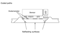 - the optically coding of the paths may be provided by printing non-reflecting regions on a piece of reflecting tape or other sticky material.