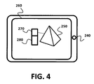 FIG. 4 illustrates an example of a tablet camera used to capture an object in the shape of a pyramid where the tablet screen is also utilized to function as a second screen.