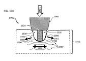 As tissue engaging strip 1920 moves past tissue 1950, moving in a direction perpendicular to (and so through) the plane of the page, the projections on tissue engaging strip 1920 therein disrupt tissue 1950, including tearing individual fibrous components 1980 of tissue 1950 (e.g. collagen or elastin fibers). Such fibrous components 1980 frequently have irregular alignments (i.e., irregular orientations) in Soft Tissues. However, as tissue 1950 is disrupted, Differential Dissecting Instrument 1900 pushes into tissue 1950 in the direction of component of motion 1901 such that as remaining tissue engaging surface 1930 and shroud 1940 push into the separated tissue 1950, they push tissue 1950, including severed fibrous components 1990, aside in the direction of arrows 1960 and 1961, aligning previously irregularly oriented fibers and straining material at the point of contact of tissue engaging strip 1920. This local region of strain aligns and strains (and so pre-stresses) unsevered fibrous components 1980 in a direction perpendicular to the direction of motion of tissue engaging strip 1920, as shown by double-ended arrow 1970, facilitating their being grabbed and increasing the likelihood of their being severed by projections from tissue engaging strip 1920. Non-tissue engaging surface 1930 and of shroud 1940 will act as a wedge if they are angled with respect to one another, as shown in FIG. 19C and FIG. 19D or even if they have a width that is wider than the tissue engaging surface 1910. In one embodiment, a semi-ellipsoid shape, as described in FIG. 3F, in which the second minor semi-axis C is a significant fraction of the first minor semi-axis B (e.g., in one embodiment, where 0.2B<C<0.8B), is an effective shape for wedging.