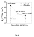 To quantitatively determine the effects of the different annealing processes compared herein, the full width at half-maximum (FWHM) of the E2 Raman modes of samples in this example were compared and plotted in FIG. 6. As can be seen from those plots, the FWHM of the E2 Raman mode decreases as the crystal quality of GaN improves. Since half of each sample in this example was masked during implantation, a comparison between the implanted and as-grown portions can be conducted. The as-implanted FWHM of the E2 mode is broad due to implantation-induced defects, while the as-grown portion has a much narrower FWHM.