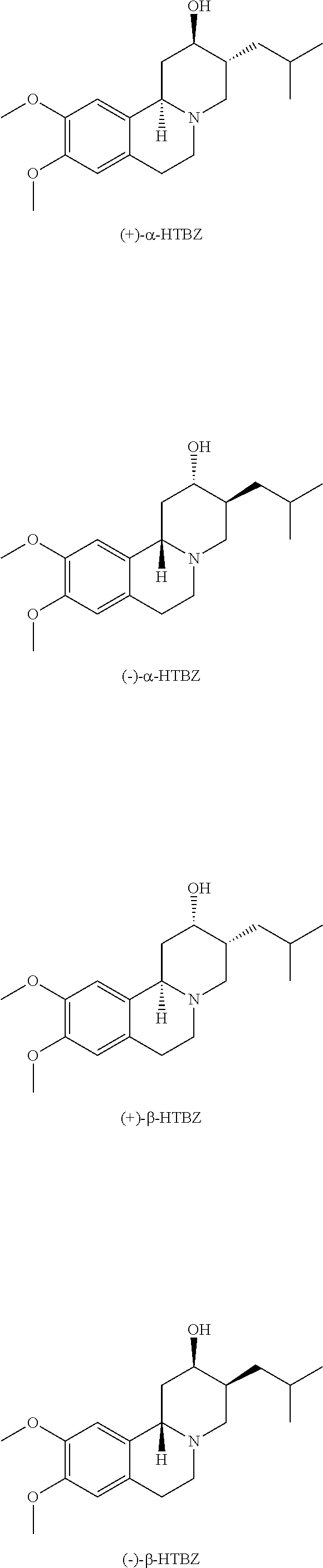 Tetrabenazine and its major metabolites alpha-dihydrotetrabenazine (α-HTBZ) and beta-dihydrotetrabenazine (β-HTBZ) are selective and potent inhibitors of the VMAT2. Scherman et al., Mol. Pharmacol. 1988, 33(1):72-7. In humans, extensive hepatic metabolism of tetrabenazine to α-HTBZ and β-HTBZ by carbonyl reductase results in plasma concentrations of tetrabenazine that are very low and are often below the limit of detection. Thus, α-HTBZ and β-HTBZ are thought to confer the pharmacological and therapeutic activity of orally administered tetrabenazine in patients. In human plasma, α-HTBZ and β-HTBZ have half-lives of 7 hours and 5 hours, respectively (Xenazine® US Prescribing Information). Alpha(α)-HTBZ and β-HTBZ are each metabolized into pairs of mono-O-desmethyl metabolites (9-O-desmethyl-HTBZ and 10-O-desmethyl-HTBZ) which are, in turn, conjugated by sulfonation and/or glucuronidation for excretion. The 9-O-desmethyl-β-HTBZ metabolite, which is derived from β-HTBZ, is also a major circulating metabolite. CYP2D6 is primarily responsible for O-demethylation of α-HTBZ and β-HTBZ in humans.