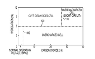 - FIG. 2 illustrates the relationship between production of CO 2 and hydrocarbon gas for overcharged and overdischarged battery states for a Li-ion battery cell