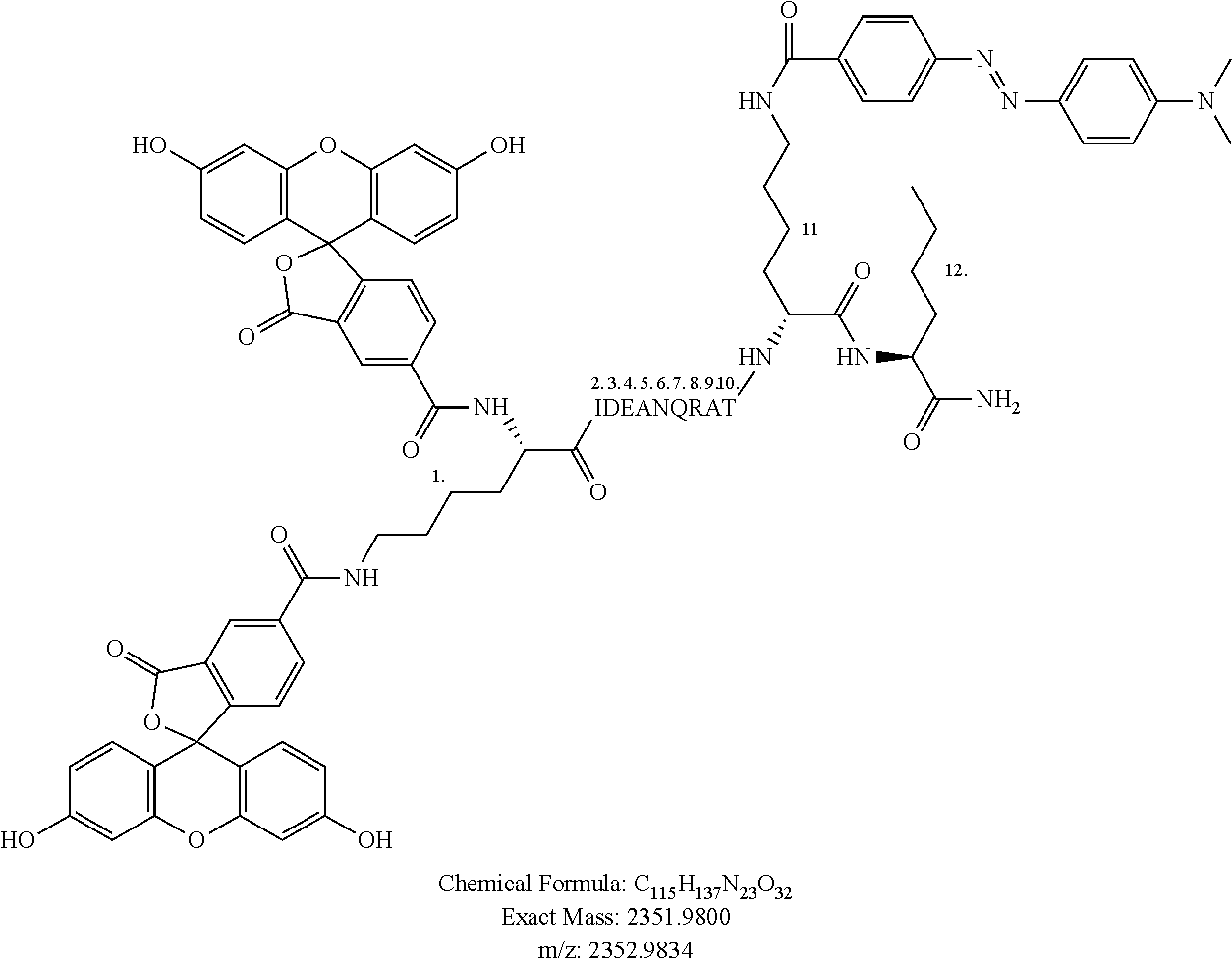 FIG. 20 shows a schematic and matrix-assisted laser desorption/ionization (MALDI) mass spectrum for the novel BoNT/B ALISSA substrate. The BoNT/B specific substrate (SEQ ID NO: 24) contains amino acid residues 59-78 of the VAMP protein that is specifically cleaved by BoNT/B at the expected site of natural VAMP cleavage, between the glutamine and phenylalanine. Both the fluorophore, 5-carboxyfluorexcein (5-FAM), and the quencher, 4-dimethylamino phenyl azo enzoic acid (DABCYL), were placed on the ε-amino groups of lysine residues that are part of the natural VAMP sequence, allowing for a non-inhibited enzyme substrate interaction. High specificity cleavage of the substrate by BoNT/B was indicated using MALDI-MS resulting in product at m/z 2245.98 and m/z 1528.88. The uncleaved substrate produced a peak at m/z 3755.81.