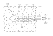 FIGS. 38 and 39 illustrate schematic views of a second stage in the process in which the motion of driving pin 522 and first driven pin 504 is halted. Driving tube 520, however, continues to move and applies a driving force to first driven tube 502, which is represented by arrows 491. This creates an imbalance of forces across prosthesis 270 as base portion 290 is driven further into tissue 600 while driving portion 274 remains in place. Eventually, base portion 290 separates away from driving portion 274 and begins to expand under the driving force of driving tube 504.