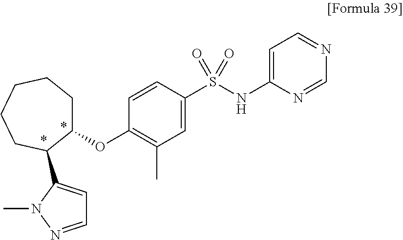 (20) A drug for a respiratory disease according to (1), wherein the compound represented by formula (I) is 2,6-difluoro-4-{[(1S,2R)-2-(1H-pyrazol-4-yl)cyclohexyl]oxy}-N-(pyrimidin-4-yl)benzenesulfonamide.