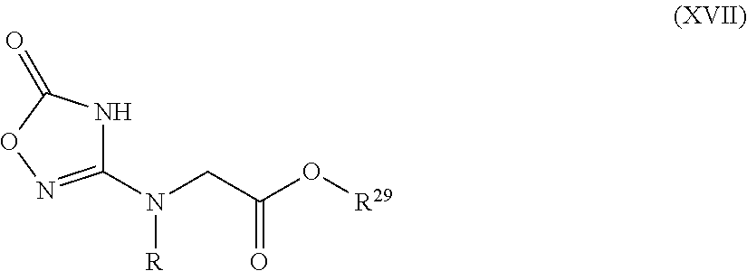 A round bottom flask equipped with a stir bar and nitrogen inlet was charged with ethyl 2-[methyl-(5-oxo-4H-1,2,4-oxadiazol-3-yl)amino]acetate (20 mg, 0.1 mmol), tetrahydrofuran (5 mL) and water (5 mL). To this mixture was added lithium hydroxide mono hydrate (4 mg, 0.1 mmol). After 1 hour the solvent was evaporated under reduced pressure and the material was purified by reverse phase chromatography eluting with water-acetonitrile modified with 0.1% trifluoroacetic acid. This gave 2-[methyl-(5-oxo-4H-1,2,4-oxadiazol-3-yl)amino]acetic acid as a white solid: 15 mg, 0.09 mmol, 90% yield. ES LC-MS m/z=174 (M+H+). 1H NMR (METHANOL-d4) δ: 3.97 (s, 2H), 2.96 (s, 3H). Melting point 150-155° C.