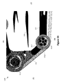The mounting of the sprung tensioning wheel 3130 on the mobile frame piece 3512 may allow the sprung tensioning wheel 3130 to move with respect to fixed pieces of the frame 110. For example, the mobile frame piece 3512 may rotate around the point 3514, which in turn may cause the sprung tensioning wheel 3130 to move in and out (back and forth between the top direction 105 and the bottom direction 106) of the frame 110. The range of motion of the mobile frame piece 3512 may be limited by the attachment of the spring 3518 between the mobile frame piece 3512 and the fixed frame piece 3516. In addition, the attachment of the spring 3518 between the mobile frame piece 3512 and the fixed frame piece 3516 may cause the mobile frame piece 3512 and thus the sprung tensioning wheel 3130 to return to a particular position of rest along their respective ranges of motion.