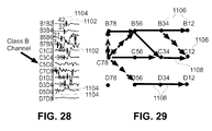 FIG. 28 and FIG. 29 provide additional details to those shown in FIGS. 22 and 24, respectively, to define a method of determining activation onsets for class B-beats using vectors. The task is to: a) find activation at C5C6 (B Beat); and b) use vectors from surrounding channels. FIG. 28 includes the same signals shown in FIG. 22 (from window 402 of FIG. 21), however it is stretched along the y-axis for enhanced clarity. As in FIG. 22, the vertical lines 1102 shown in FIG. 28 represent example activation onsets determined with respect to the time-varying cardiac signals (activation times shown in milliseconds (ms)). The numbers 1104 noted in proximity to each of the vertical lines represent the time of the activation onsets for the corresponding time-varying cardiac signal relative to a given starting time. For example, the activation onset time 1104 for cardiac signal B3B4, which is indicated as “37”, occurs before the activation onset time 1104 for cardiac signal B1B2, which is indicated as “42”. FIG. 29 shows the matrix or grid of sensors denoted by identifications 1106, such as “B34”, “B12”, “C12”, and “D12”. Likely vectors are shown in FIG. 29 as arrows or lines 1108 that connect specific sensors 1106. For example, assume that the activation onset at cardiac signal C5C6, which is denoted as a B-channel, is to be determined using vectors from surrounding channels having determinate activation onsets. From FIG. 24, the most likely vector paths through cardiac signal C5C6 (with the unknown activation onset) is from sensor C78 to C34 since alternate paths through, such as through sensor C56, would exhibit a conduction velocity that is either too fast (such as from sensor B56 to C56), or less probable (such as a zig-zag progression through sensors B78, B56, C78, and C56) than that from sensors C78 to C34. Accordingly, the outcome of the analysis indicates that the activation onset for the cardiac signal C5C6 is derived using a vector, which is not necessarily linear, between the activation onsets associated with sensors C78 and C34, and thus cardiac signals C7C8 and C3C4, respectively.