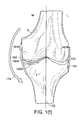 FIG. 1(d) is a perspective view of a knee joint with a medial compartment defect subject to a corrective force aligning the femur and tibia in a desired alignment;
