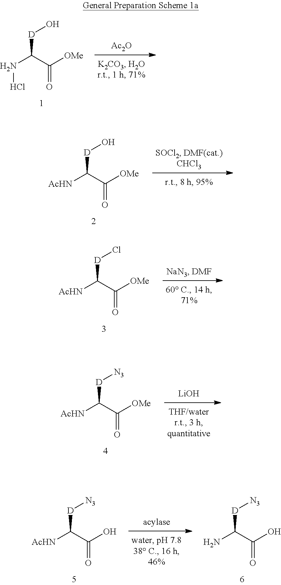 Acylase I (100 mg. Sigma, A3010, Grade I) was added into a solution of acetamide A5 (0.91 g, 3.4 mmol) in water (60 mL). After pH of the solution was adjusted to 7.8 with 1 N aqueous lithium hydroxide solution. The reaction mixture was stirred at 38° C. for 16 h. Active carbon (2 g) was added and the solution was stirred for 10 min. The mixture was filtered through a pad of Celite. The filtrate was concentrated to around 20 mL, which was directly used for purification by HPLC. Fractions containing pure product (1) were combined and concentrated to dryness. The final sample was dried by lyophilization to afford amino-acid (1) (0.35 g, 46%) as white powder. LCMS m/z: 222 (M+1), 220 (M−1). 1H NMR (300 MHz, D2O) δ 8.36 (s, 1H), 7.71 (d, J=7.5 Hz, 1H), 7.26 (d. J=7.5 Hz, 1H), 4.36 (s, 2H), 3.98 (dt, J=2.7 and 6.5 Hz, 1H), 3.32-3.16 (m, 2H).