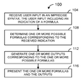 - FIG. 1 is a flow diagram of an example method for providing one or more formulas to a user based on an input that may be in an imprecise syntax;