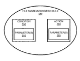 In any of the examples herein, a file system condition rule can take any of a variety of formats, such as the example format shown for a rule 540 in FIG. 5. In the example, the rule 540 includes a condition 550 with zero, one, or more parameters 555 and a respective action 560 with zero, one, or more parameters 565. When executed, the action 560 can be applied when the condition 550 is detected.