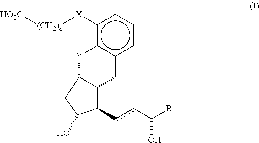 wherein a is an integer of from 1 to 3; X and Y, which may be the same or different, are selected from —O— and —CH2-; R is —(CH2)5-R1 wherein R1 is hydrogen or methyl, or R is cyclohexyl, or R is —CH(CH3)CH2C≡CCH3; and the dotted line represents an optional double bond; or a physiologically acceptable salt or acid derivative thereof.
