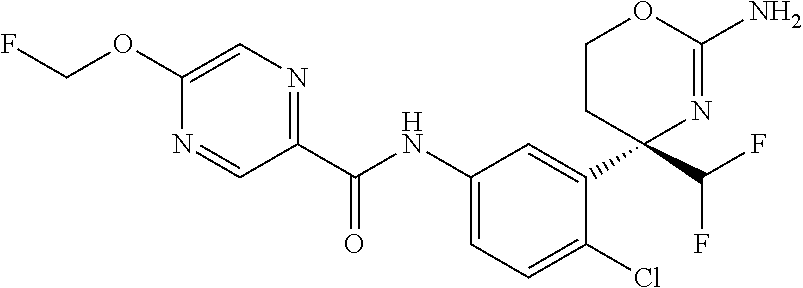 - CNHXESHXTGNRBK-FNGAVSAYSA-N [H][C@@]12CC(F)(F)C[C@]1(CF)OC(N)=N[C@@]2(CF)C1=CC(NC(=O)C2=CC=C(C#N)C=N2)=CC=C1F.[H][C@]12CC(F)(F)C[C@@]1(CF)OC(N)=N[C@]2(CF)C1=CC(NC(=O)C2=CC=C(C#N)C=N2)=CC=C1F.[H][C@]12CC(F)(F)C[C@@]1(CF)OC(N)=N[C@]2(CF)C1=CC(NC(=O)C2=CC=C(Cl)C=N2)=CC=C1F Chemical compound [H][C@@]12CC(F)(F)C[C@]1(CF)OC(N)=N[C@@]2(CF)C1=CC(NC(=O)C2=CC=C(C#N)C=N2)=CC=C1F.[H][C@]12CC(F)(F)C[C@@]1(CF)OC(N)=N[C@]2(CF)C1=CC(NC(=O)C2=CC=C(C#N)C=N2)=CC=C1F.[H][C@]12CC(F)(F)C[C@@]1(CF)OC(N)=N[C@]2(CF)C1=CC(NC(=O)C2=CC=C(Cl)C=N2)=CC=C1F CNHXESHXTGNRBK-FNGAVSAYSA-N 0.000 description 2