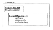 For illustrative purposes, and with reference to FIG. 1, a logical representation of content 102 is shown, in various embodiments, content 102 may comprise content data 104. Content data 104 may provide information about content (e.g., a general description of content, such as a name of the item associated with, the content). Thus, for example, content data 104 may specify that content 102 is related to a “Hawaiian vacation” (e.g., content 102 may comprise an offer for a Hawaiian vacation). Content may comprise menu content. Menu content may, in various embodiments, comprise content related to one or more menu items as described in U.S. Ser. No. 13/488,197, filed Jun. 4, 2012, and entitled “SYSTEMS AND METHODS FOR DELIVERING TAILORED MENU CONTENT BASED UPON A CONSUMER PROFILE,” which is hereby incorporated by reference. Content 102 may further comprise one or more characteristics or content metadata 106. Content metadata 106 may provide additional information about content (e.g., one or more attributes or characteristics associated with the content). For example, where content data 104 may broadly indicate that content 102 is related to a “Hawaiian vacation,” content metadata 106 may more particularly indicate that content 102 is also associated with “Travel,” a “June offer,” and/or “Scuba diving.”