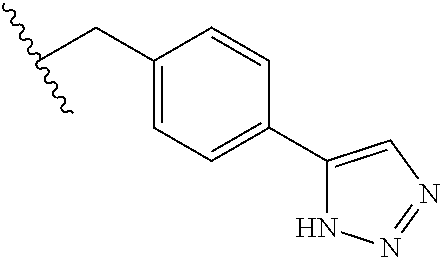 Another synthetic route to the inventive compounds involves amination of 2,4-dichloro-5-methylpyrimidine with 4-aminobenzylamine to give compound 102, arylation of 102 with 2-isopropylphenylboronic acid in the presence of silica-bound DPP-Pd and a base such as sodium carbonate in a solvent such as a mixture of DME/water under the influence of microwave irradiation to give compound 103, diazotization of the aryl amino group with t-butyl nitrite and TMS-azide to give 104, and then reaction of the azido moiety with TMS-acetylene in the presence of cupric sulfate in a solvent such as methanol/water, followed by treatment with TFA, to give compound 82.
