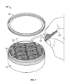 FIG. 2C depicts an exemplary arrangement of polymer orifices and air orifices for a melt-blowing apparatus. Air orifices 124 can be adjacent to the polymer orifices 122. As shown in FIG. 2C, the air orifices 124 may surround each polymer orifice 122. Each combination of a polymer orifice 122 with surrounding air orifices 124 is called a spinneret 129. For example, the melt-blowing device 120 can have between 10 and 500 spinnerets 129 per square inch. The polymer orifices 122 and the gas velocity through gas orifices 124 can be combined to form fibers of 100 microns or less. In some embodiments, the melt-blown fibers have an average diameter of 30 microns or less. In particular embodiments, the melt-blown fibers have an average diameter of between 0.5 and 5 microns. In some embodiments, the spinnerets 129 each have a polymer orifice diameter of less than 900 microns. In some embodiments, the spinnerets 129 each have a polymer orifice diameter of at least 75 microns. The average polymer orifice diameter can range from 75 microns to 900 microns. In particular embodiments, the average polymer orifice diameter can be between 150 microns and 400 microns. In certain embodiments, polymer orifice diameters of about 180 microns, about 230 microns, about 280 microns, or about 380 microns are used.