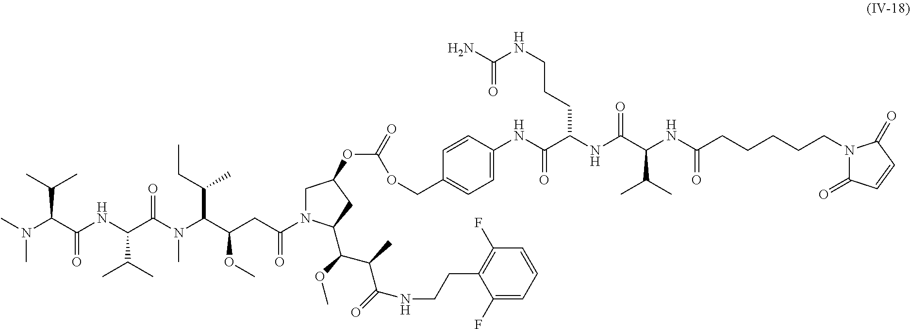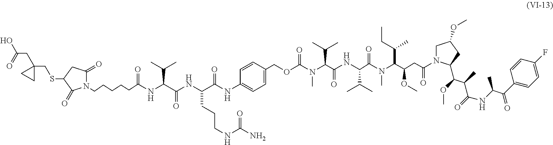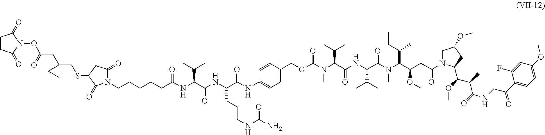 U.S. Pat. No. 6,214,345 discloses an ADC in which a cytotoxic drug, such as doxorubicin, Taxol, etc., is coupled to an antibody via an enzyme-cleavable peptide linker that can be cleaved by the lysosomal protease cathepsin. Also, U.S. Pat. No. 7, 964,566 discloses an ADC in which a cytotoxic drug, such as MeVal-Val-Dil-Dap-norephedrine (MMAE) and MeVal-Val-Dil-Dap-Phe (MMAF), is attached to an antibody through an enzyme-cleavable peptide linker.