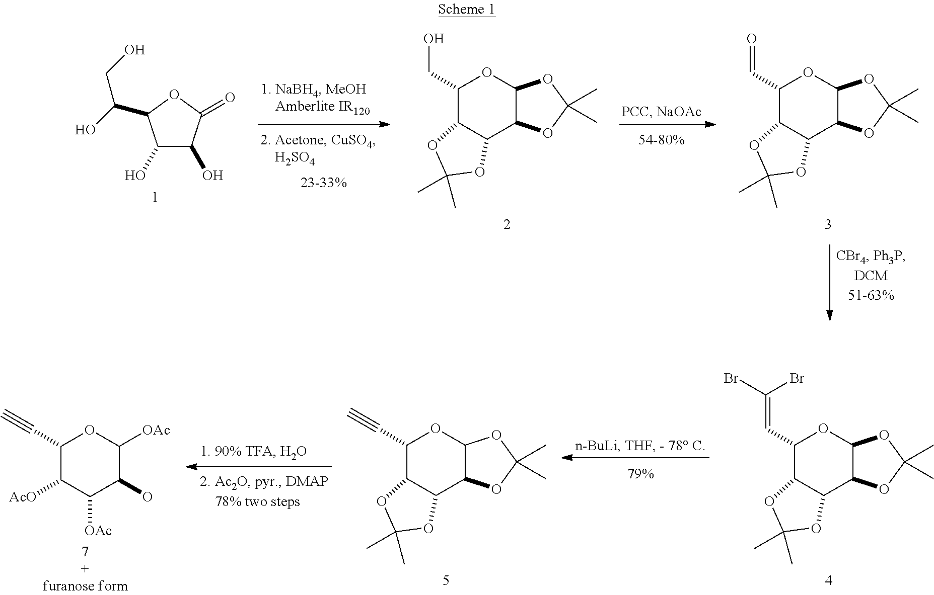 As used herein, “alkynyl fucose peracetate” refers to any or all forms of alkynyl fucose (5-ethynylarabinose) with acetate groups on positions R1-4 (see formula I and II, infra), including 6-ethynyl-tetrahydro-2H-pyran-2,3,4,5-tetrayl tetraacetate, including the (2S,3S,4R,5R,6S) and (2R,3S,4R,5R,6S) isomers, and 5-((S)-1-hydroxyprop-2-ynyl)-tetrahydrofuran-2,3,4-triyltetraacetate, including the (2S,3S,4R,5R) and (2R,3S,4R,5R) isomers, and the aldose form, unless otherwise indicated by context. The terms “alkynyl fucose triacetate”, “alkynyl fucose diacetate” and “alkynyl fucose monoacetate” refer to the indicated tri-, di- and mono-acetate forms of alkynyl fucose, respectively.