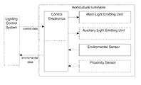 FIG. 3 shows the relationship between a horticultural lumaire and a lighting control system.