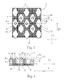 By “projected area” is meant an area of a surface as it would be projected in the Z-direction onto an X-Y plane, 44, as shown in FIGS. 5 and 6, and as indicated by arrows 45 in FIG. 5. As shown, the framework of knuckles 6 can be described as having a plurality of multi-stage surfaces. In FIG. 5 two surfaces are shown, a first surface 30 residing in a first plane P1 and a second surface 32 residing in a second plane P2. While two surfaces are described, the invention is not limited to only two surfaces. For each surface, the area of the surface can be determined by projecting in a Z-direction as indicated by arrows 45 the surface area of the surface to an X-Y plane, 44. As shown in FIGS. 5 and 6, for example, the area of first surface 30 can be projected to be Area 1, 40 in the X-Y plane, and the area of second surface 32 can be projected to be Area 2, 42 in the X-Y plane. As can be appreciated from the description herein, Area 2, 42, is smaller than, and fully bounded by Area 1, 40. That is, no part of the portion of the second surface 32 of the framework 20 extends over or beyond the area of first surface 30 in the X-Y plane, as would be the case if any part of the extended portion 28 was cantilevered over base portion 26. Correspondingly, the structure of the framework of knuckles 6 that forms second surface 32 is smaller than, and fully “bounded,” so to speak, in the X-Y dimension, by the structure of the framework that forms the first surface 30.