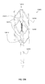 Deployment of the needles 1700 in each jack assembly 700 (or the number of needles can be any number less than the number of jack assemblies 700) is illustrated, for example, starting with FIG. 5. In this example, the needles 1700 in each of the four jack assemblies 700 has a length that is shorter than the longitudinal end-to-end distance of the proximal and distal drive blocks 720, 710 because the needles 1700 have not yet protruded from the distal upper surface 612 of each distal drive block 710 even though the stent lattice 110 is partially expanded. When the stent lattice 110 has expanded slightly further, however, as shown in FIG. 7, the needles 1700 begin protruding from the distal upper surface 612. As the needles 1700 are prebent as set forth above, the needles 1700 immediately begin bending into the natural pre-set curved shape. See also FIGS. 7 and 8. FIG. 10 illustrates two needles 1700 even further extended out from the distal needle lumen 1711 (only two are shown because this is a cross-section showing only the rear half of the stent lattice 110). FIG. 11 illustrates two needles 1700 in a fully extended position (as the distal and proximal drive blocks 710, 720 touch one another in the most-expanded state of the stent lattice 110). FIGS. 9, 13, 16, 17, 18, and 21 also show the needles 1700 in an extended or fully extended state.