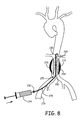 FIG. 8 is a front view with exposed blood vessels depicting a coated balloon supported on a balloon catheter positioned with the balloon at an abdominal aortic aneurysm.