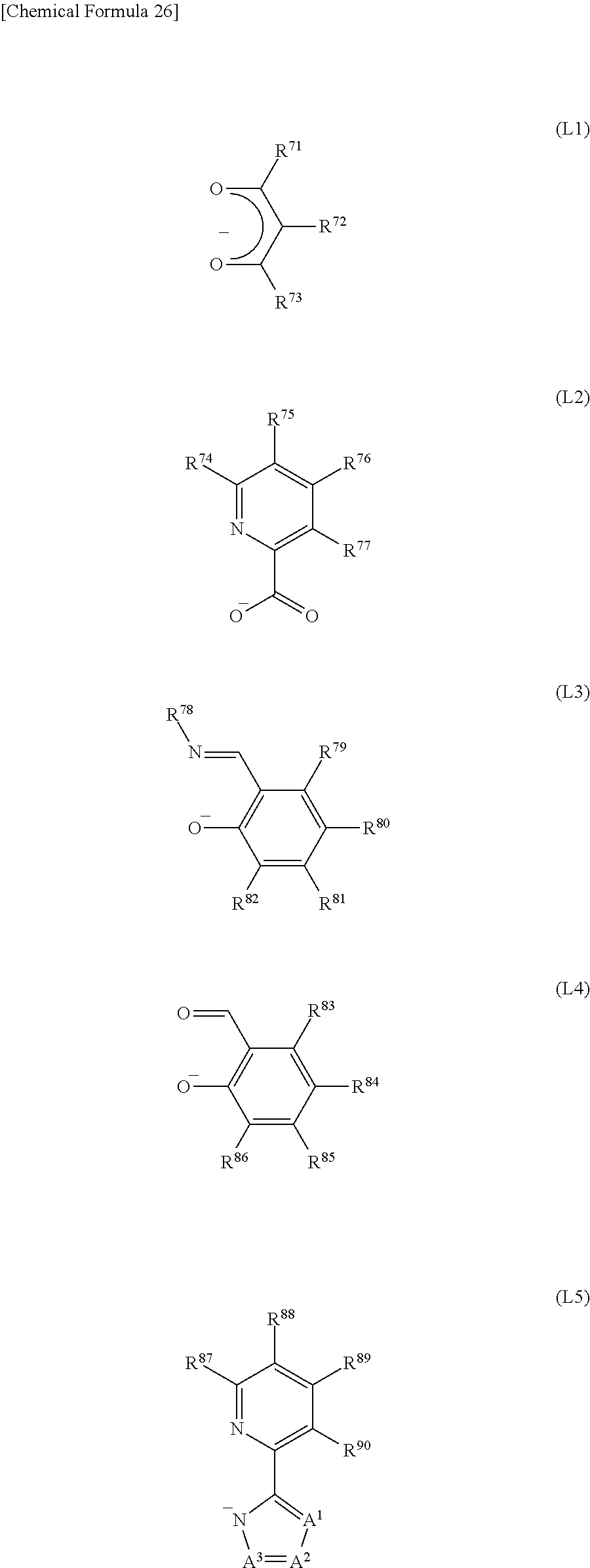 Note that in General Formulae (L1) to (L12), R29 to R32 and R71 to R102 each independently represent any one of hydrogen, a substituted or unsubstituted alkyl group having 1 to 6 carbon atoms, a halogen group, a vinyl group, a substituted or unsubstituted haloalkyl group having 1 to 6 carbon atoms, a substituted or unsubstituted alkoxy group having 1 to 6 carbon atoms, and a substituted or unsubstituted alkylthio group having 1 to 6 carbon atoms. Ar represents a substituted or unsubstituted aryl group having 6 to 10 carbon atoms. Specifically, a substituted or unsubstituted phenyl group having 6 to 10 carbon atoms or a substituted or unsubstituted naphthyl group having 6 to 10 carbon atoms can be given. A1 to A3 each independently represent nitrogen, sp2 hybridized carbon bonded to hydrogen, or sp2 carbon bonded to a substituent R; A4 to A11 each independently represent nitrogen or sp2 carbon bonded to the substituent R; and the substituent R is an alkyl group having 1 to 6 carbon atoms, a halogen group, a haloalkyl group having 1 to 6 carbon atoms, or a phenyl group. X1, Y1, Z1, X2, Z2, Z3, X4, and Y4 each independently represent a nitrogen atom or a carbon atom. Note that two or three of X1, Y1, and Z1 in General Formula (L8) each represent a carbon atom, and the carbon atom may have a substituent or no substituent. In each of combinations of X2 and Z2 in General Formula (L9), Y3 and Z3 in General Formula (L10), and X4 and Y4 in General Formula (L11), in the case where one of them represents a nitrogen atom, the other represents a carbon atom. In the case where X, Y, and Z each represent a carbon atom, the carbon atom may have a substituent or no substituent.