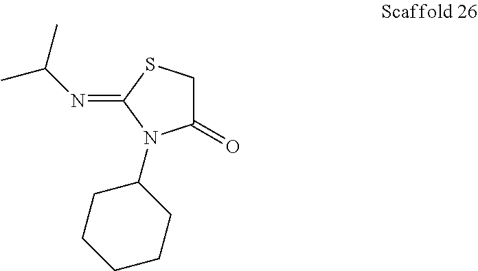 5-[3-Chloro-4-(2-hydroxy-ethoxy)-benz-(Z)-ylidene]-2-[(Z)-methylimino]-3-phenyl-thiazolidin-4-one is obtained as an off-white powder starting from Scaffold 36 (150 mg, 0.727 mmol) and 3-chloro-4-(2-acetoxy-ethoxy)-benzaldehyde (353 mg, 1.45 mmol) following Method D. LC-MS: tR=0.91 min, [M+1]+=389. 1H NMR (CDCl3): δ 7.69 (s, 1H), 7.63 (d, J=2.3 Hz, 1H), 7.55-7.40 (m, 4H), 7.35-7.30 (m, 2H), 7.05 (d, J=8.2 Hz, 1H), 4.25-4.20 (m, 2H), 4.08-4.00 (m, 2H), 3.27 (s, 3H).