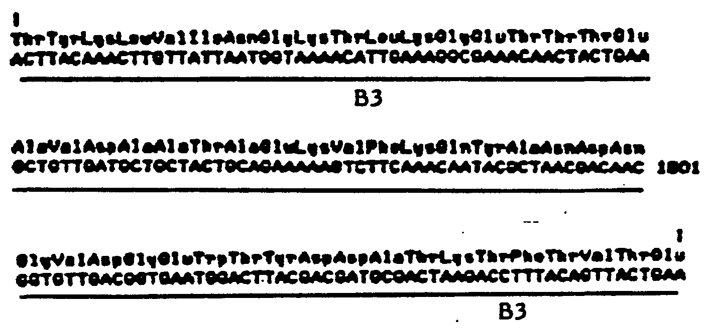 - Figure 6 shows the partial restriction map of mGX7880, a bacteriophage vector which contains two complete copies of the B structure and lacks all amino acid sequences distal to B1 and B2.