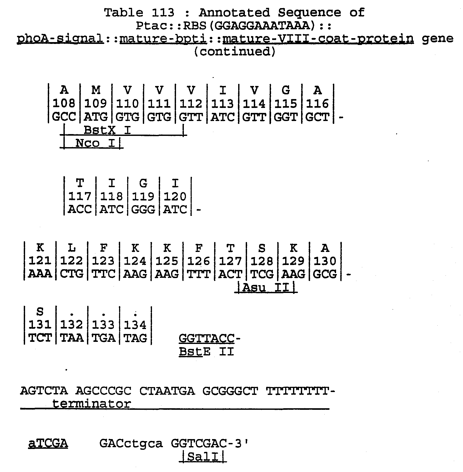 Similar constructions could be made with other filamentous phage. Pf3 is a well known filamentous phage that infects Pseudomonas aerugenosa cells that harbor an IncP-1 plasmid. The entire genome has been sequenced (LUIT85) and the genetic signals involved in replication and assembly are known (LUIT87). The major coat protein of PF3 is unusual in having no signal peptide to direct its secretion. The sequence has charged residues ASP7, ARG37, LYS40, and PHE44-COO- which is consistent with the amino terminus being exposed. Thus, to cause an IPBD to appear on the surface of Pf3, we construct a tripartite gene comprising: